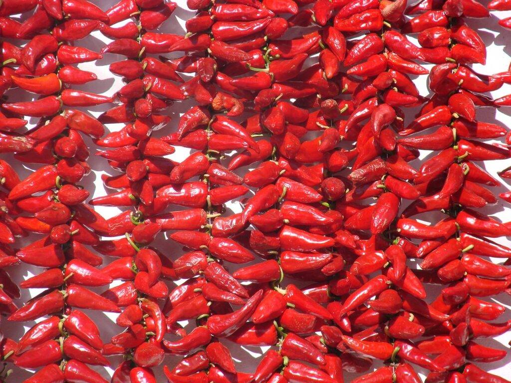Le piment d’Espelette est récolté quand il rougit, et aussitôt enfilé sur des cordes pendues pour le séchage, sur la façades des fermes. Une fois sec, les piment sont broyés et moulus.