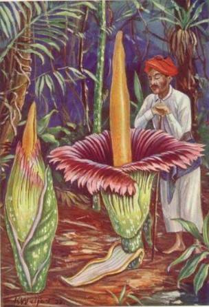През XIX в. ботаникът от Флоренция, (Италия) Одоардо Бекари (1843- 1920) е на експедиция в Atger Mantior, Суматра. На 6 август, 1878 год., той наблюдава листа и плодове на непознато за Европа растение. През същата година на 5 септември Бекари има възможността да наблюдава и цъфнал екземпляр на същото това растение. Ботаникът изпраща няколко луковици и семена от това него във Флоренция. От луковиците не пониква нищо, но някои от семената покълват. От покълналите семена са изпратени и в Кралската ботаническа градина в Лондон. През 1898 год., единайсет години след откриването на това растение, за първи път негов екземпляр цъфти в условията на европейския климат, а не в тропичните условия на своята коренна родина. Растението е огромно и е наречено гигантски корен. Научното му име Conophallus titanium е дадено през ноември в годината на откриването му. През 1879 год. Arcangeli дава официалното и признато и до днес научно име на гигантския корен от Индонезия, Amorphophallus titanium (Becc.) Becc. ex Arcang. Листото на растението остава между 12 и 20 месеца на стъблото, а през това време се образува нова луковица. След кратка фаза се развива пъпка. Тя прераства в листо и този процес се повтаря. При определена възраст и тегло на луковицата, от пъпката може да се развие стълб с цвете. Ако цветът не е опрашен, стълбът умира. Но след кратка фаза отново се образува пъпка, от която пониква листо.