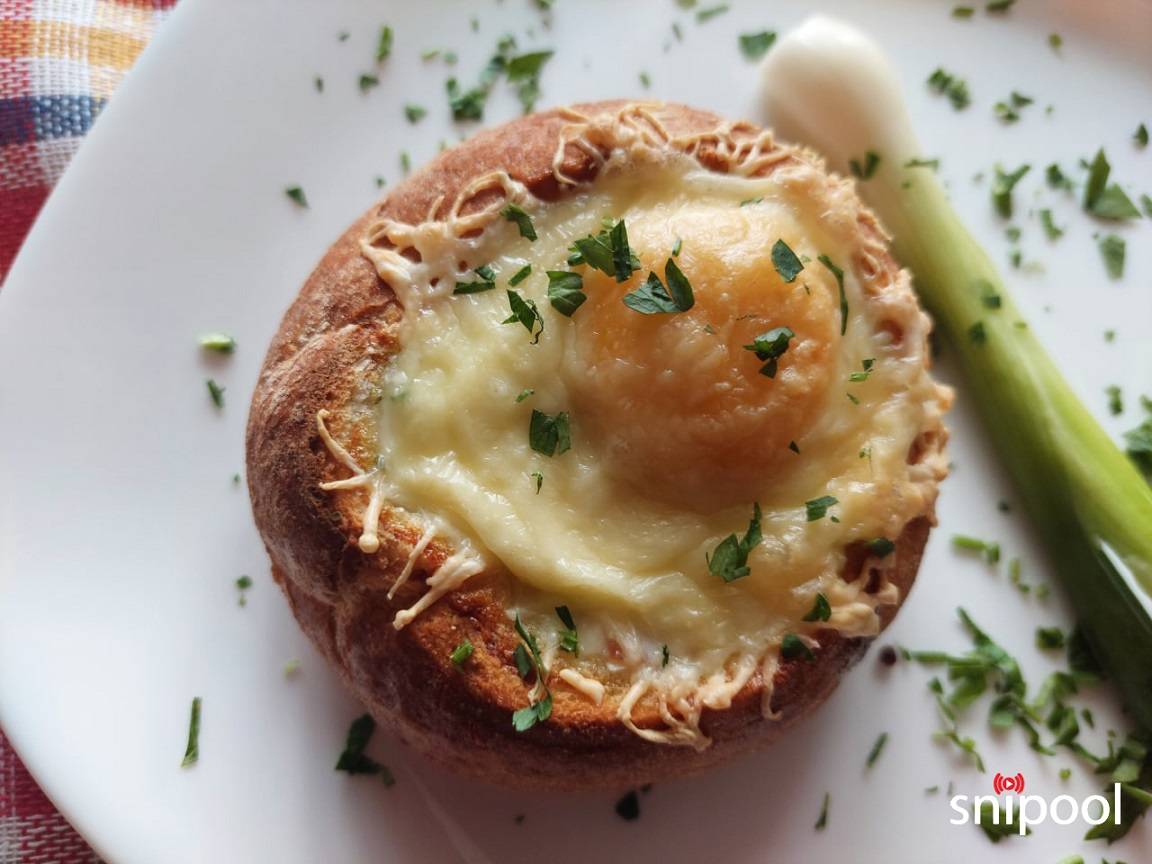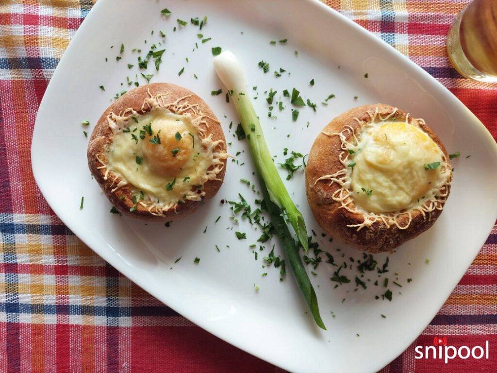 - Слагаме плънката – нарязана печена червена чушка, домати (консерва или пресни), пресен лук, колбас по желание и завършваме с 1 яйце.