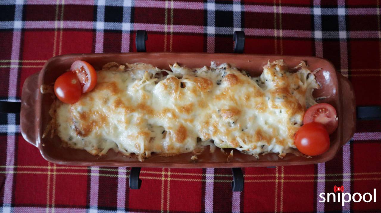- Сипваме съдържанието на тигана в керемида, настъргваме в тази последователност – пармезан, синьо сирене, топено сирене и кашкавал. Запичаме в предварително загрята фурна на горен реотан за 10-12 минути на 180 градуса.