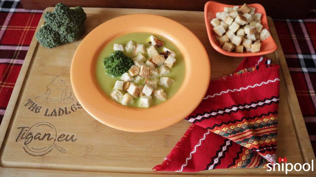 - В дълбока чиния сипваме супата, добавяме запеченото краве сирене и крутони.