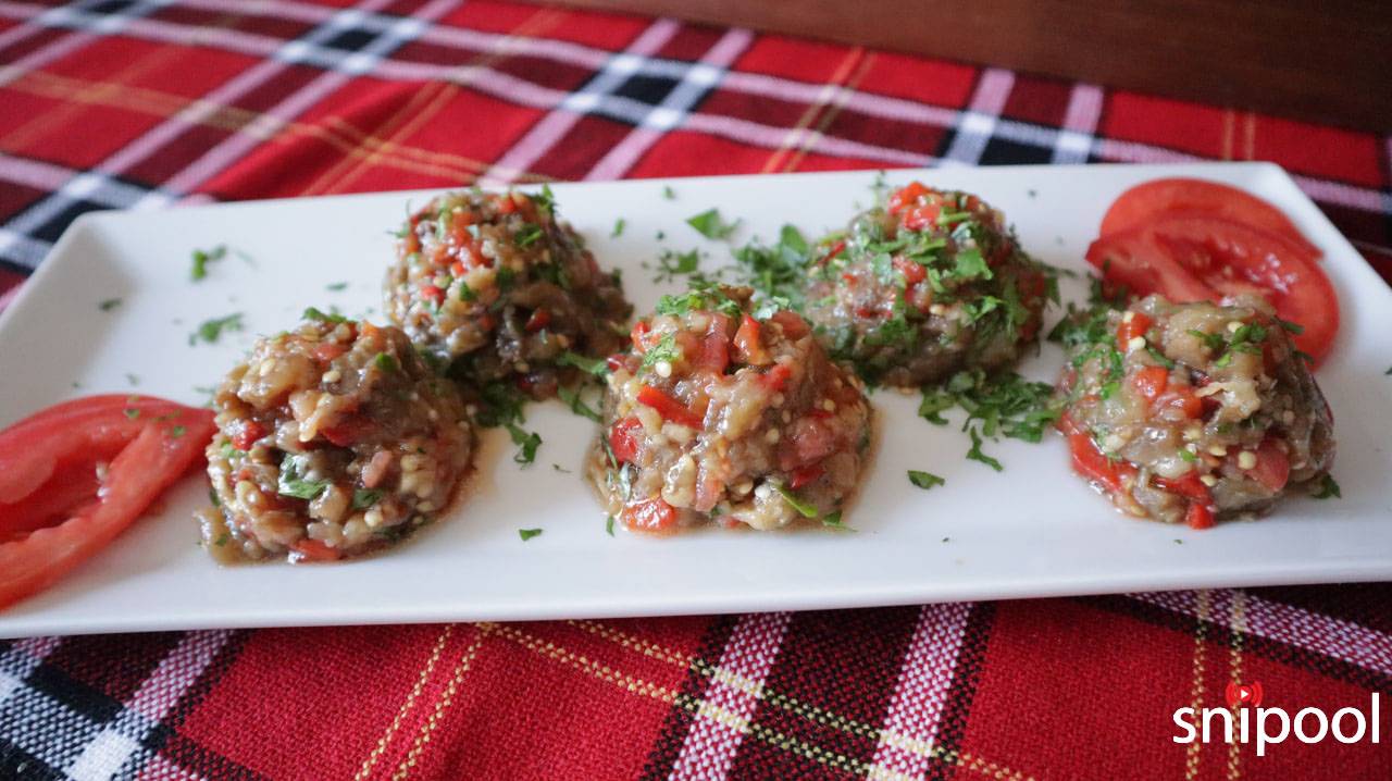 - След като са се изцедили, нарязваме на ситно патладжаните (може да ги почистим и от семките) и червената чушка и ги слагаме в дълбок съд. Добавяме домата и чесъна, след което овкусяваме добре със сол, оцет и зехтин (олио). Нарязваме на ситно магданоз и 1/2 от него добавяме към кьопоолуто. Разбъркваме добре и презентираме или на топки с лъжица за сладолед или в дълбока чиния, като поръсваме с останалия магданоз.