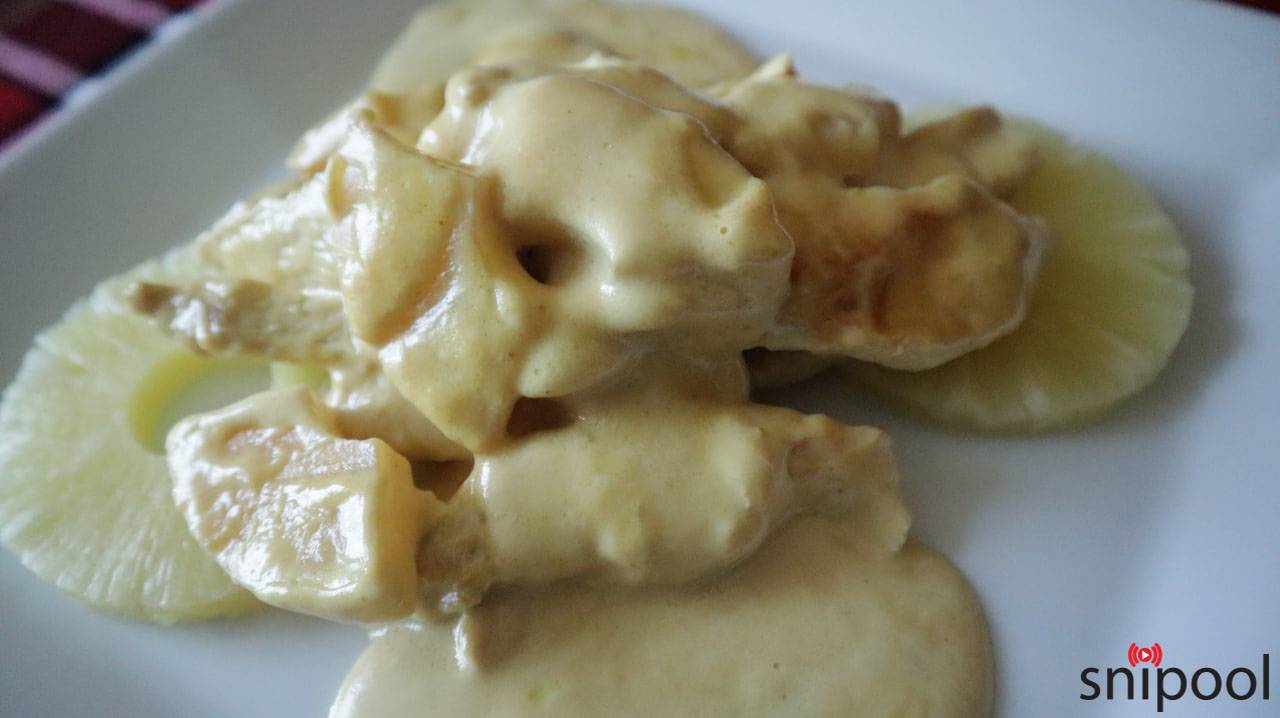 - След като се изпари сока, слагаме резенчетата ананас, овкусяваме с къри, 1-2 минути след това добавяме готварската сметана и бъркаме докато сгъсти.